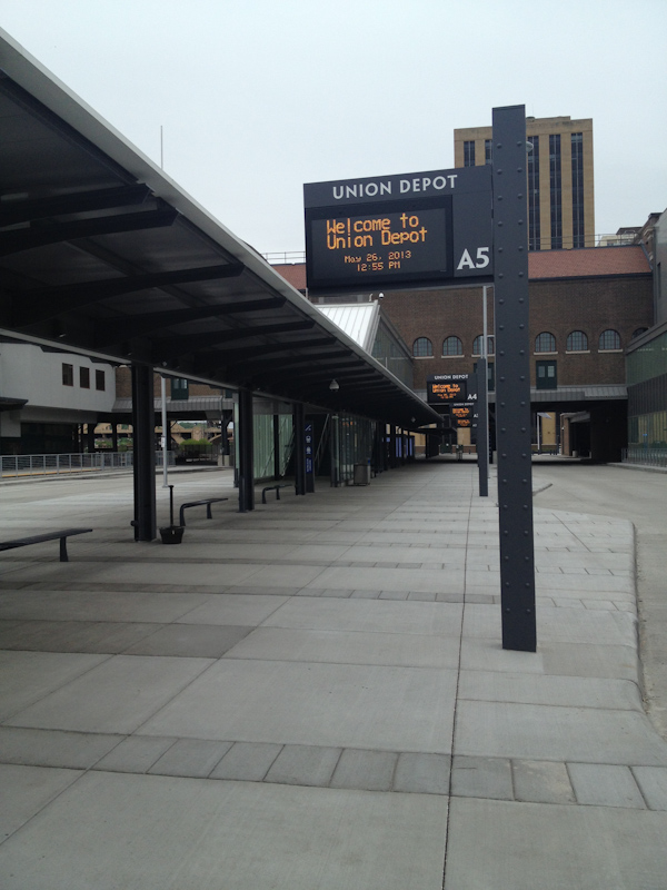 Union Depot 214 4th St E St Paul, MN (Stand under the clock facing the Greek restaurant).